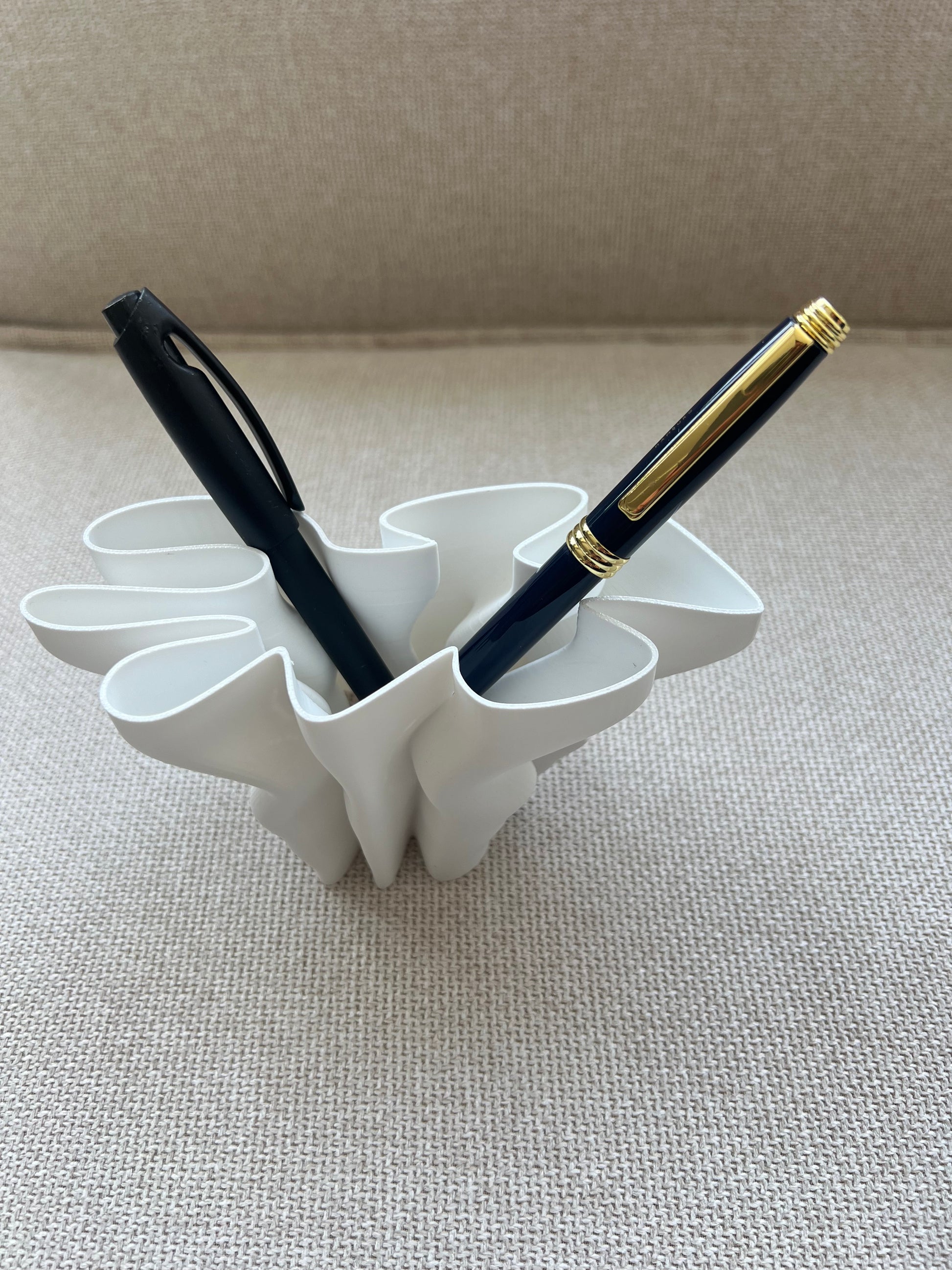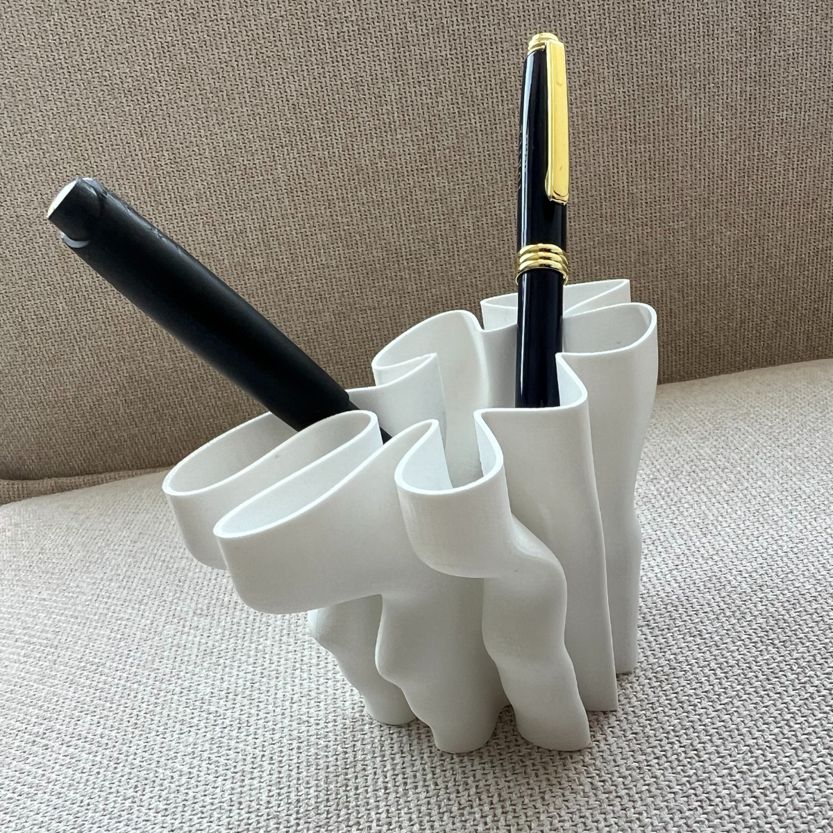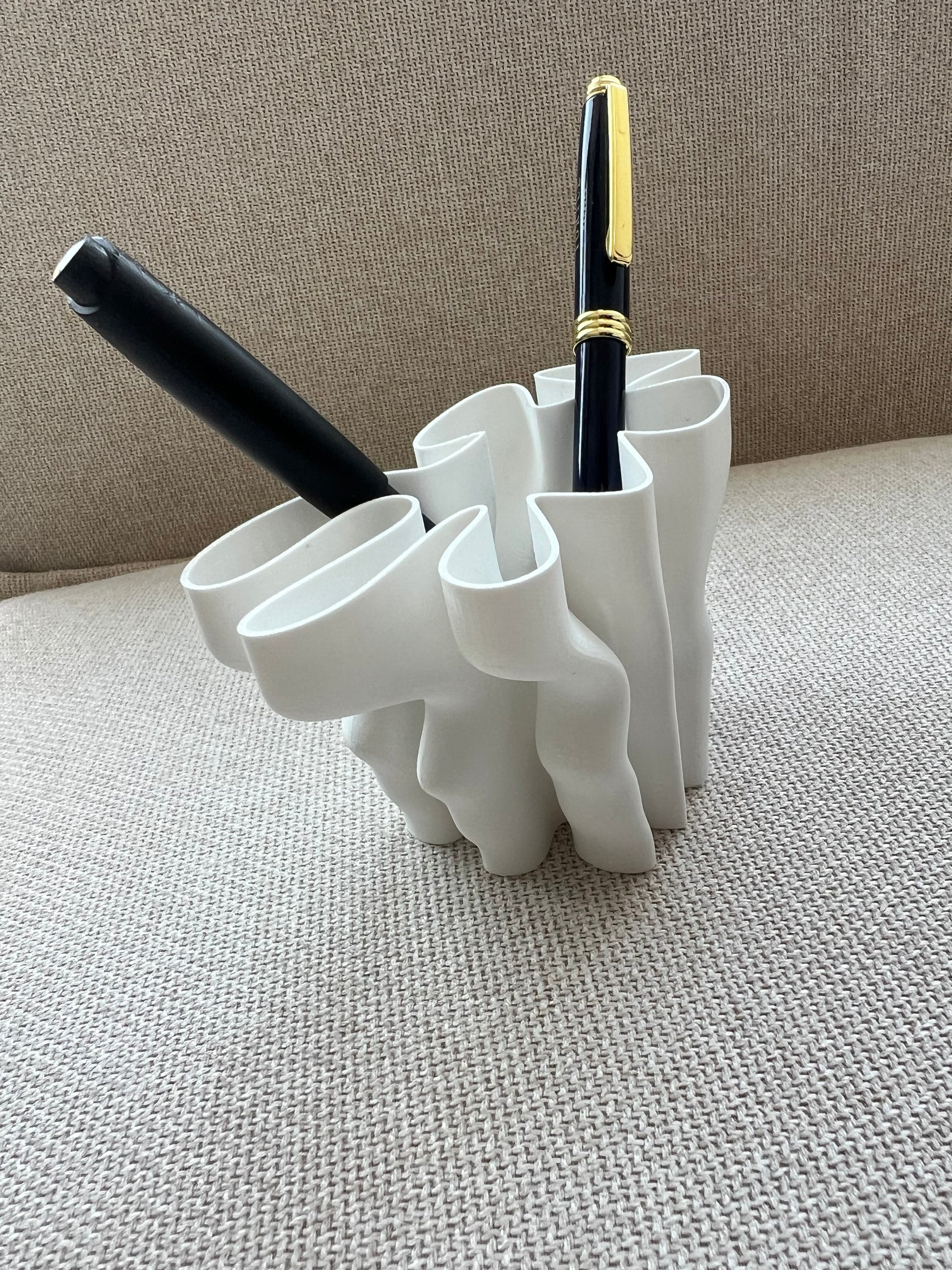 - Einzigartiges Formkonzept: Der Stiftehalter besticht durch seine ungewöhnliche und auffällige Form, die an eine moderne Skulptur erinnert. Er bietet mehrere Fächer in verschiedenen Größen, die ausreichend Platz für Stifte, Marker und andere Schreibutensilien bieten.