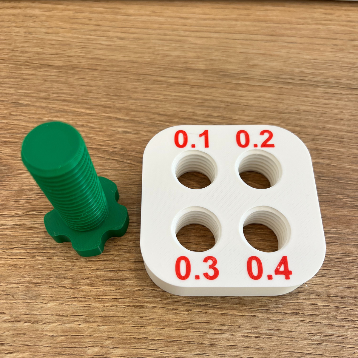 Diese STL-Datei dient zur Prüfung der Gewindetoleranzen beim 3D-Druck. Sie enthält mehrere Gewinde mit unterschiedlichen Toleranzabstufungen von 0,1 mm bis 0,4 mm. Durch das Drucken und Testen dieser Gewinde kannst du ermitteln, welche Toleranz für deine Druckereinstellungen und dein Material am besten geeignet ist. So kannst du sicherstellen, dass deine gedruckten Gewinde optimal passen und sich leicht verschrauben lassen, ohne zu viel oder zu wenig Spiel zu haben.